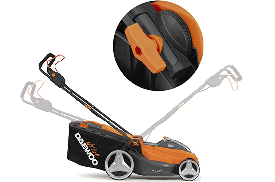 Рукоятка газонокосилки регулируется для выбора оптимальной высоты в зависимости от роста человека, использующего газонокосилку.